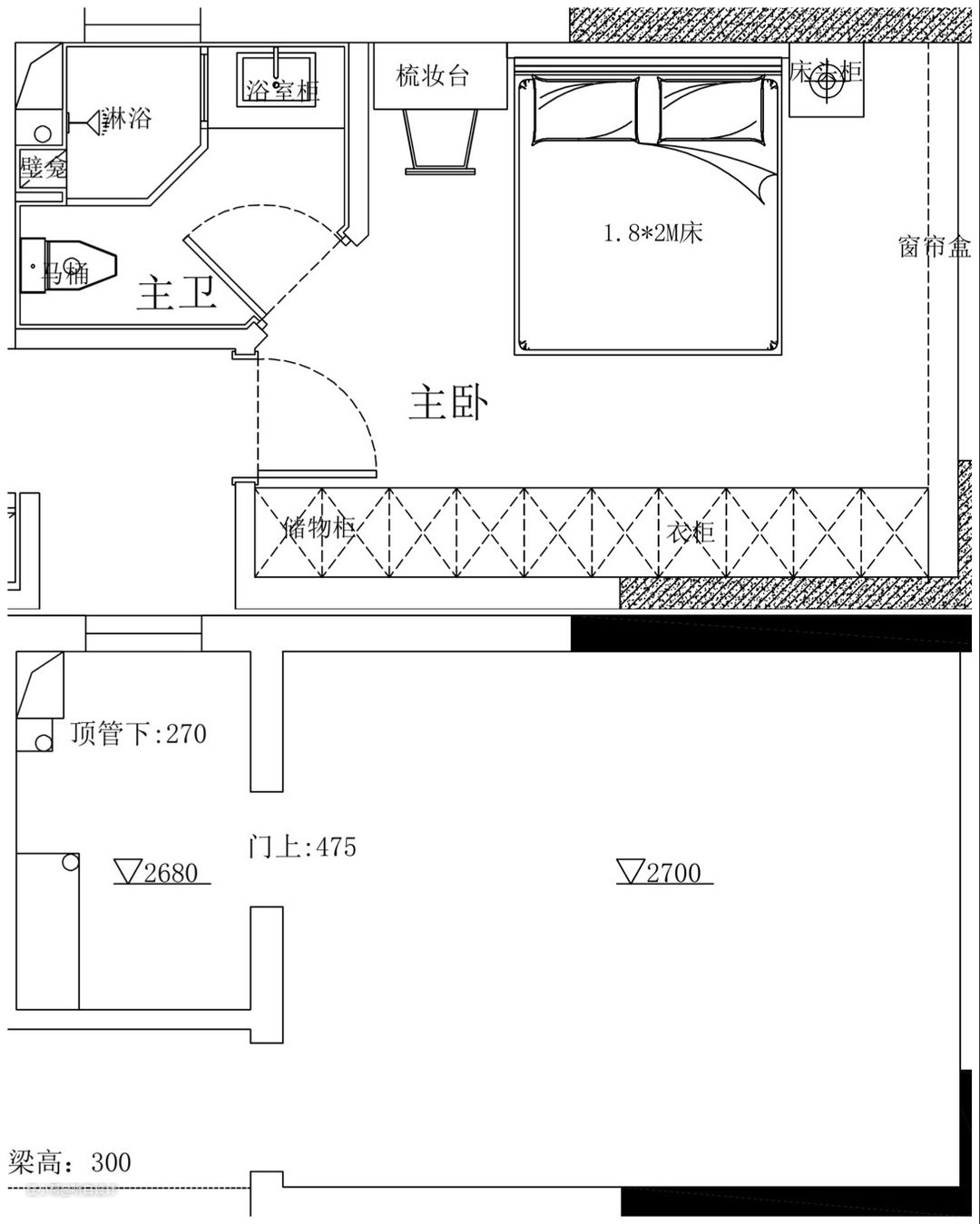 在床尾预留了大量的衣物收纳,预留后期婴儿床的位置,为了动线顺畅,修改卫生间门洞。