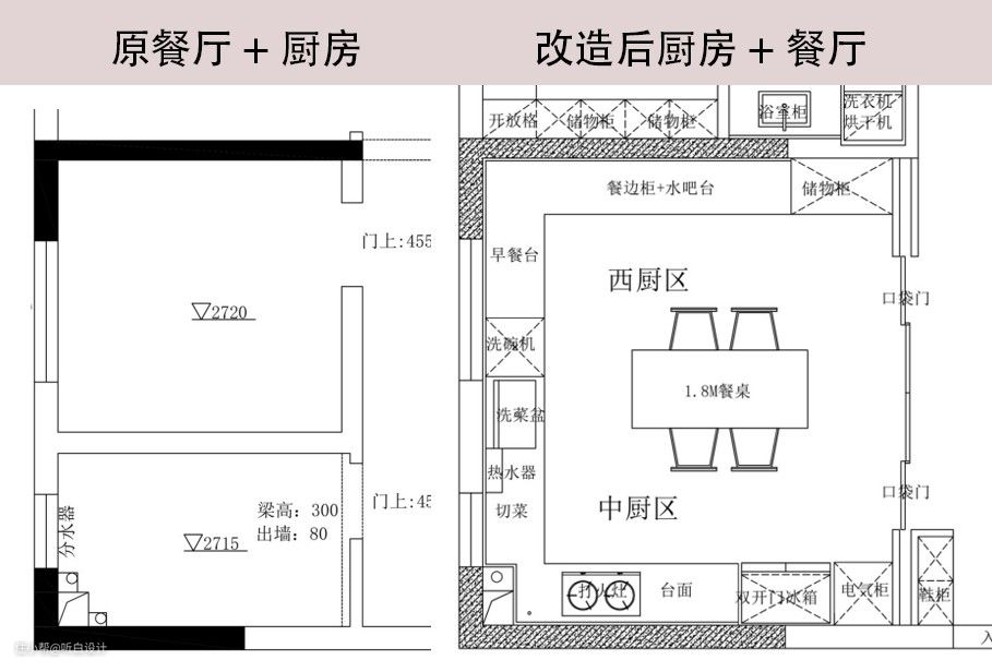 原本的厨房空间较小,小姐姐想要的家用电器比较多,放不下也很拥挤。所以我们就把厨房和小北卧合并,尽可能扩大厨房的空间,做成了一个超大的餐厨一体的开放式厨房。这样就可以做U形设计,餐桌放在中间,形成一个大的洄游动线,动线明晰,让烹饪和用餐都流畅舒适。