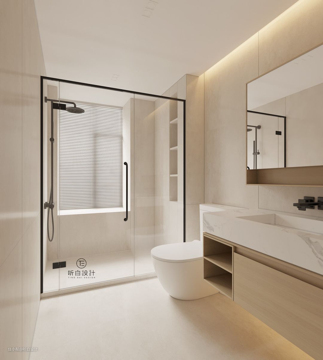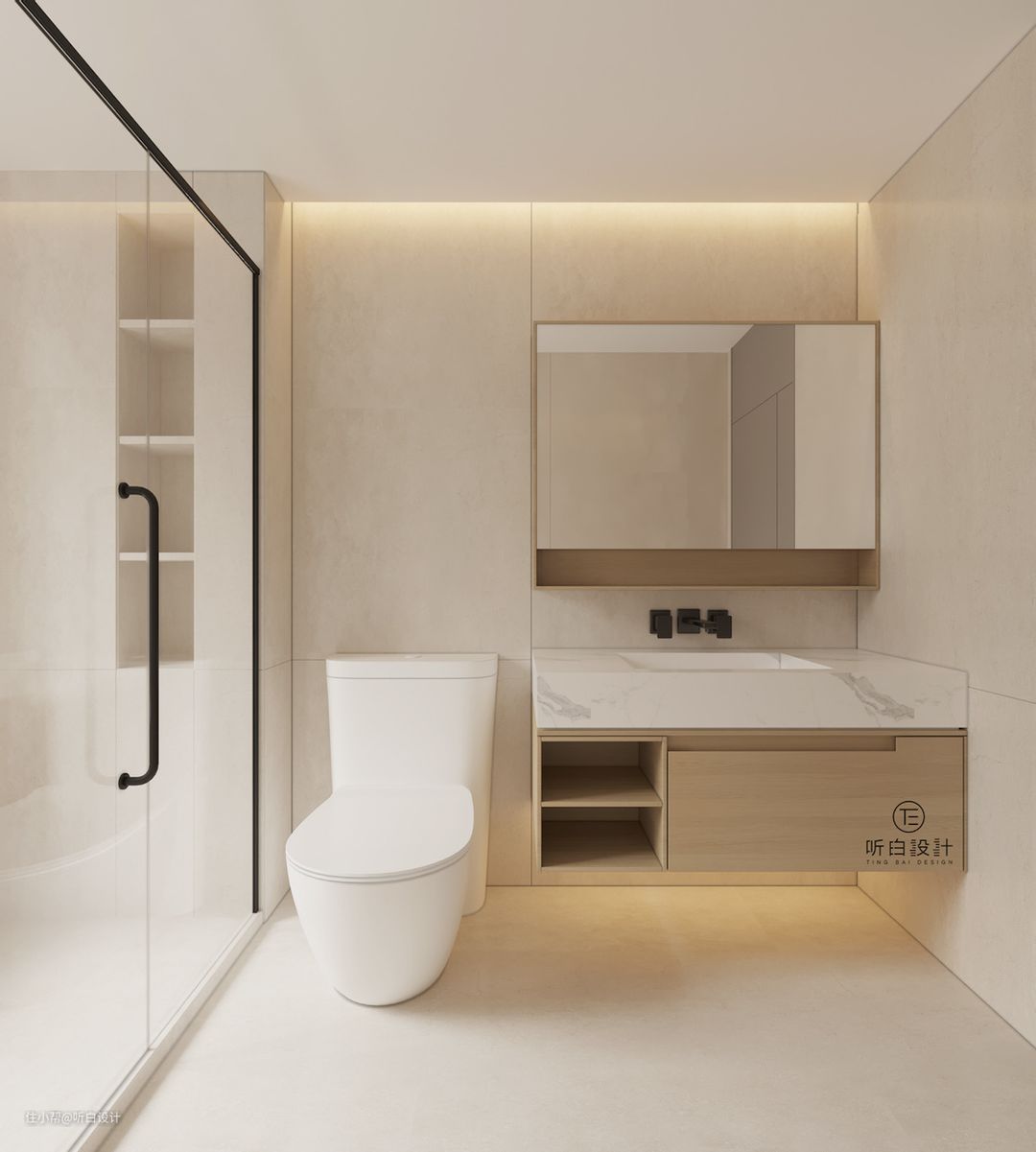 卫生间采用同色柔光砖铺贴,让整个空间呈现洁净感和延展开来的通透效果。