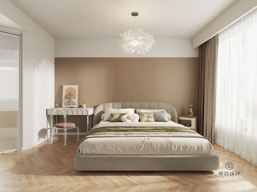 卧室采用浅木色的鱼骨拼木地板和棕褐色的背景墙色漆,再搭配同色系的窗帘,共同营造暖调温柔的氛围。