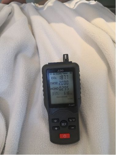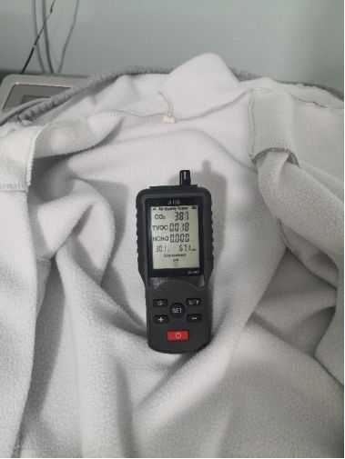 因为三台测试的合资洗衣机属于中档价位产品,太高端的衣物护理功能也没有,这里只能简单的给大家测试一下空气洗/蒸汽洗的祛味能力:在外套喷上香水,用空气质量检测仪检测喷洒后的空气质量,TVOC值直接爆表。