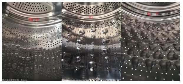 三台洗衣机内筒有效容积前文已经做了测试,这里不再赘述;纹路方面,厂家的功能宣传就比较多、比较杂了,有加速渗水过滤泥沙、有形成水膜减少衣物摩擦、增强洗净能力等等,看看听听,了解就行。