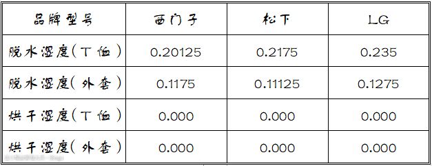 三台洗衣机在脱水阶段都是采用的1400转的脱水转速,因为衣物材质的差异,棉质的T恤含水量较高,化纤的外套和外裤含水量较小,品牌之间脱水湿度的差异对最终烘干湿度影响比较小,只是会影响烘干的时间和能耗(这一点在测试7中有反映)。