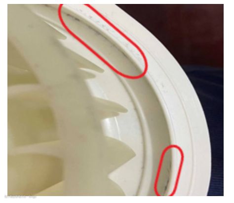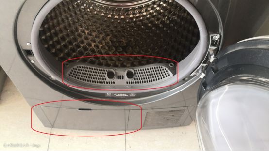 上图是洗烘一体机烘干3次床上四件套后,电机口绒毛堆积情况。可以明显看红圈处绒毛已经有堆积的苗头。惠而浦等少量的洗烘一体机会把烘干风道做成光滑平面,有的品牌还会想办法改变结构以求加装上毛屑收集器,这些设计都可以延缓毛絮的堆积。不过很可惜,本次测试的三台洗烘一体机均没有以上设计。