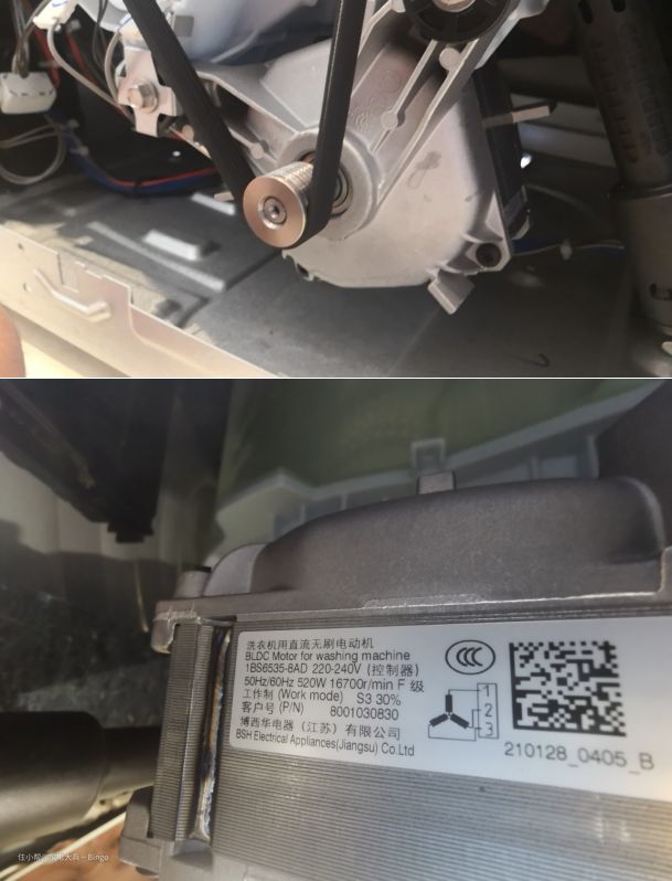 西门子080W采用的也是皮带传动,电机是博西华(博士-西门子),这就是老牌家电厂零配件的自给自足。