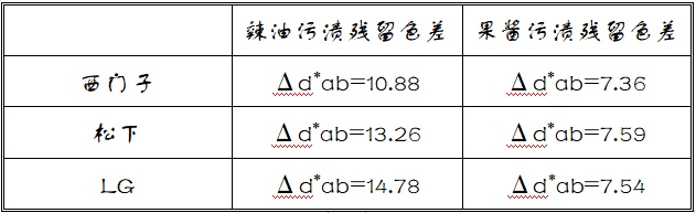 在“白度ASTM”标准下,以#f6f4f1为标准色(T恤颜色和标准色之间的色差值为Δd*ab=6.7,测量的色差越接近6.7,洗净能力越强),测得三台合资洗衣机的色差如下: