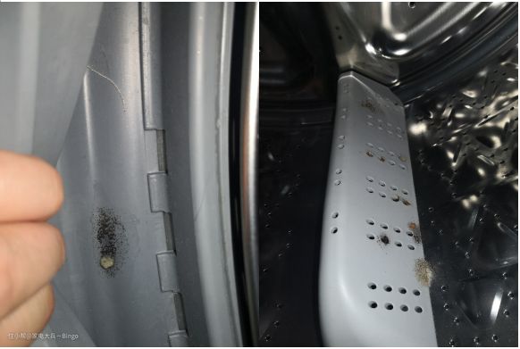 如果会有较长时间不使用洗衣机,在运行完筒自洁等类似程序后,一定要用干净不脱毛的毛巾将洗衣机皮圈和内筒中残留的毛屑擦拭干净,并把门打开透气,否则就是上图的模样——松下LD166筒自洁后,12天没有使用洗衣机,内部开始出现明显霉斑。