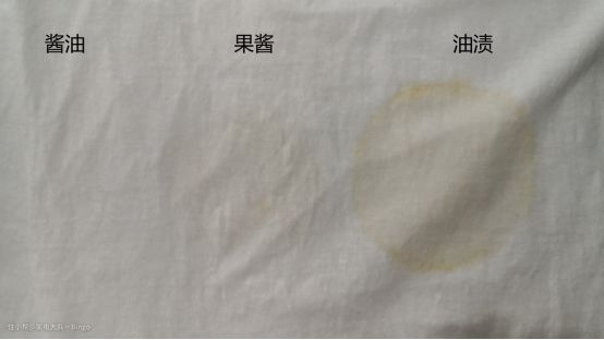 洗涤完后自然风干,仅从图片可以看到辣油残留比较明显,果酱稍有残留(图片压缩后很难观察到),酱油渍基本洗净。