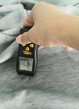 依然使用上个测试试验中的洗涤物,在洗衣机执行完洗涤、烘干程序后,立即将洗涤物取出,使用湿度计分别在T恤、外套的正反面不同位置取10个湿度值,去掉最大的三个和最小的三个数值,中间的四个测量数值取平均数;