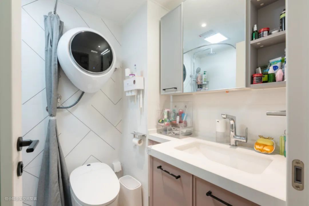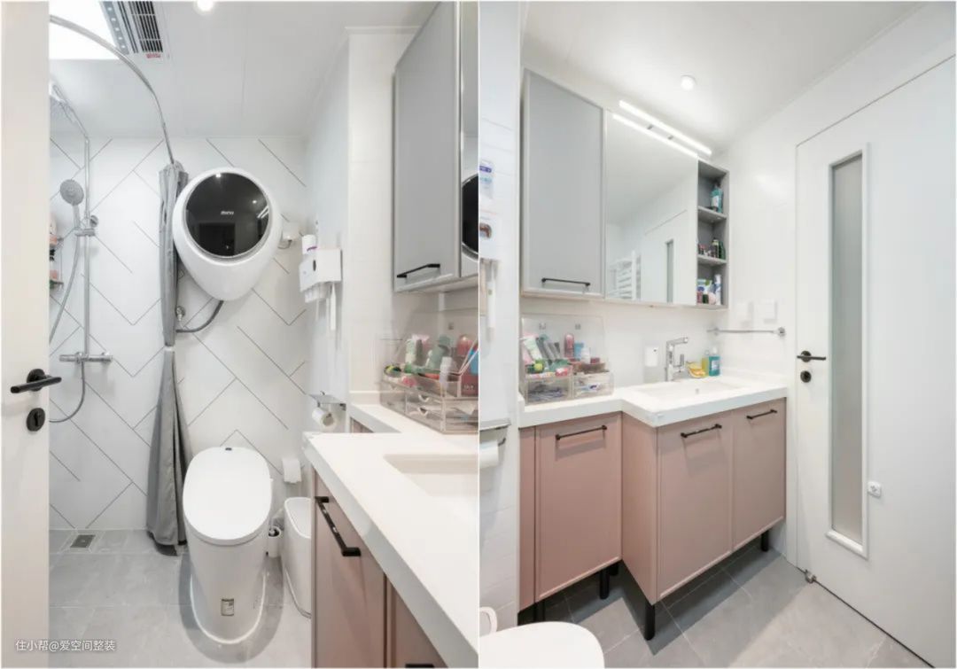 卫生间的洗漱台选择了清新可爱的粉色,不规则的柜体既增加了储物空间又不影响每个功能区域的活动行为。