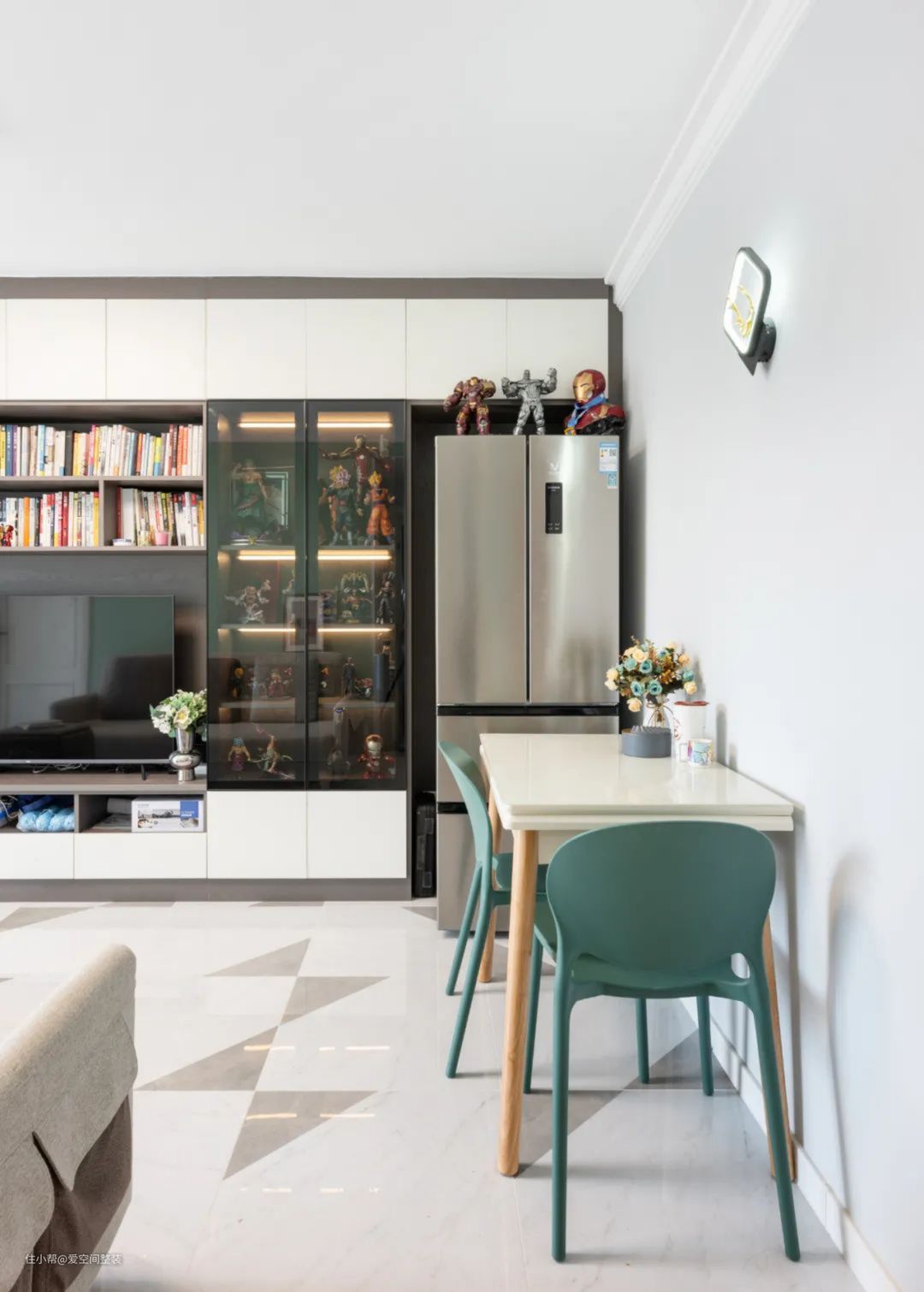小巧的白色餐桌紧靠墙面摆放,预留出了足够的动线区域。