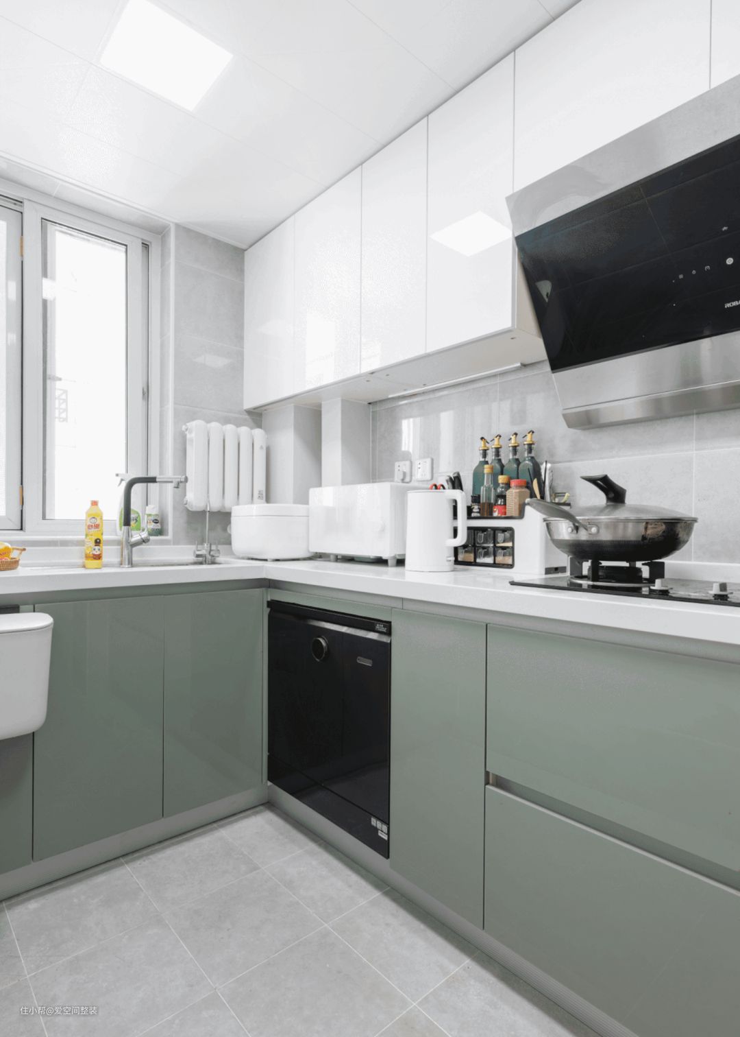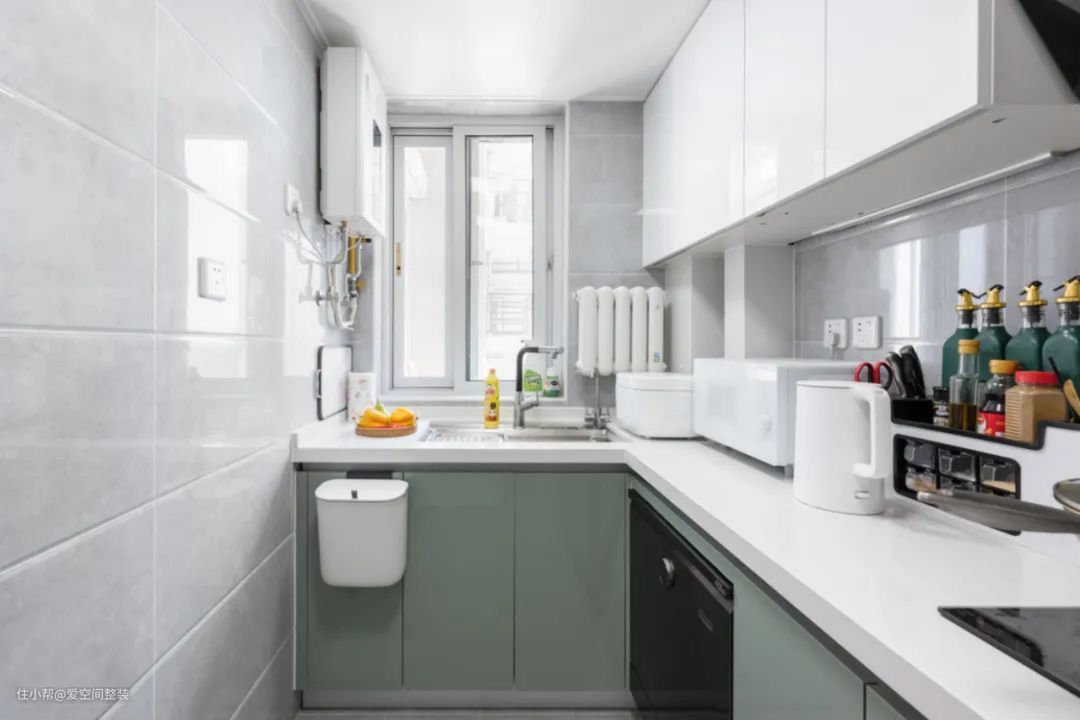 厨房同样选择了饱和度较低的莫兰迪色作为主色调。