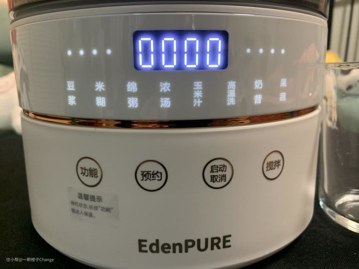 底座下方是手触按键,功能模式显示,还有一小块屏显,可以看到主要功能有:豆浆、米糊、绵粥、浓汤、玉米汁、奶昔、果蔬、高温洗。