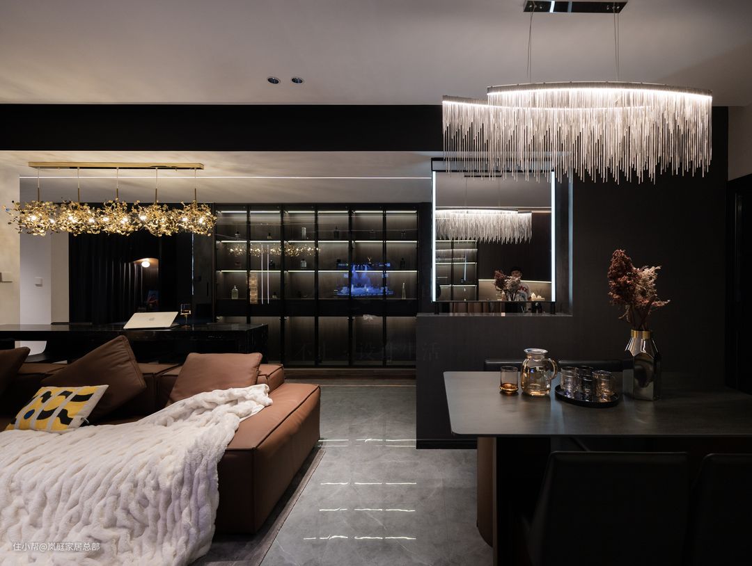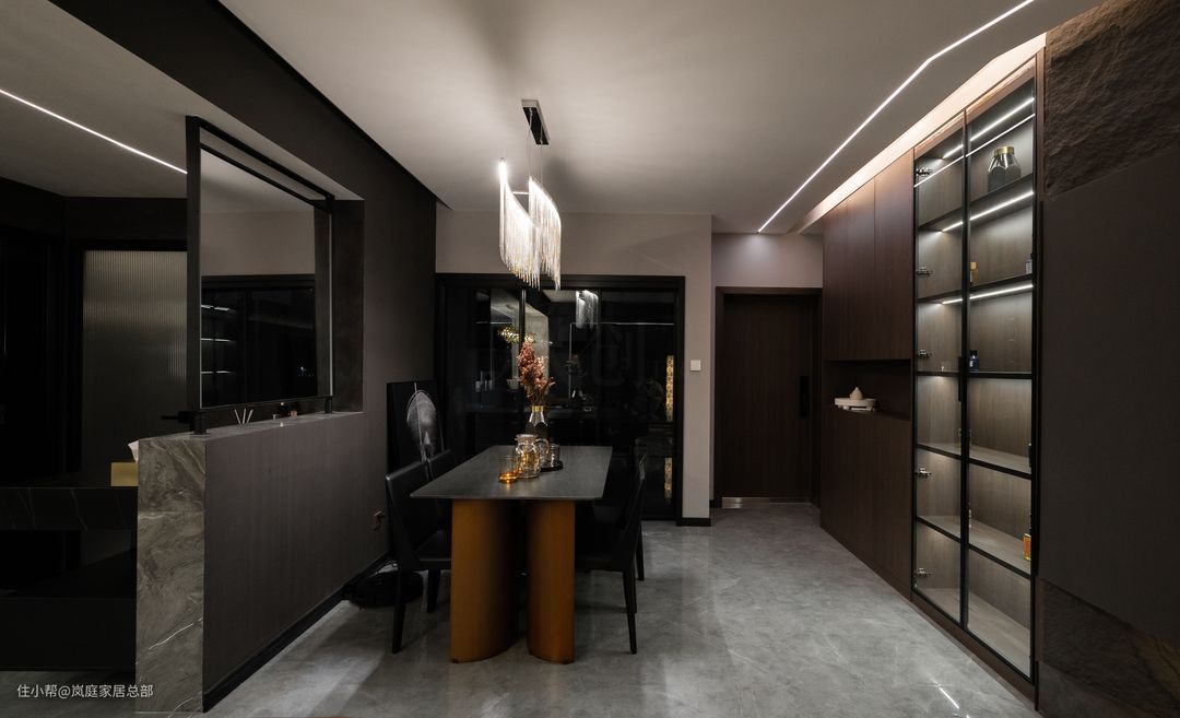 从另一个角度看餐厅全景,设计师从入户就做了线条灯带,加入隐藏在平面吊顶里的灯带,充足的光源让深色调的空间也充满着最大化的明亮度。