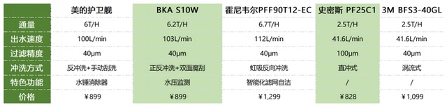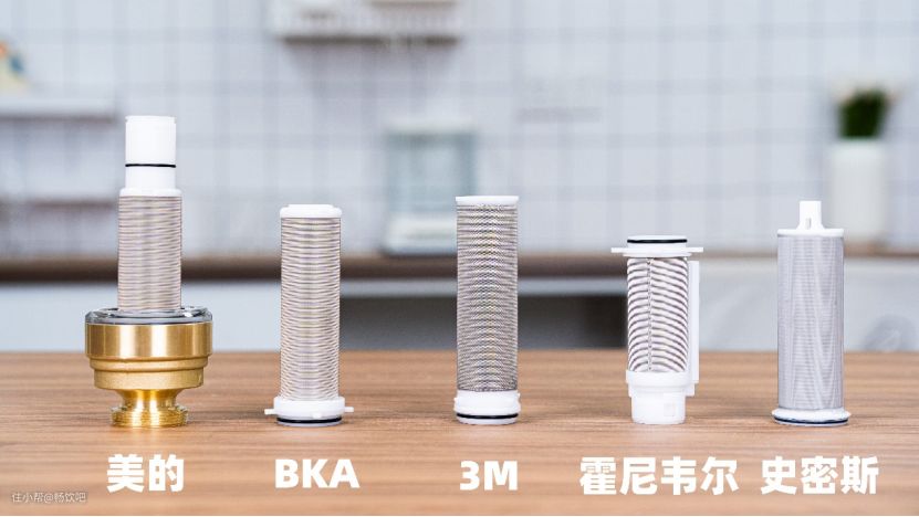 在五款前置过滤中,美的、BKA、霍尼韦尔以及3M的过滤精度均为40μm,只有史密斯的过滤精度为100μm。
