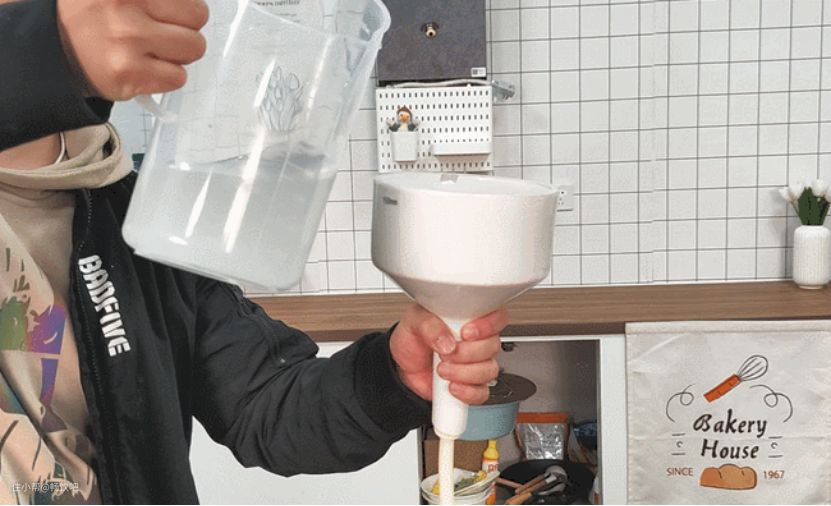 将调制好含有杂质的水放在入水处,开启水泵,用量杯在出水口接住过滤后的水。