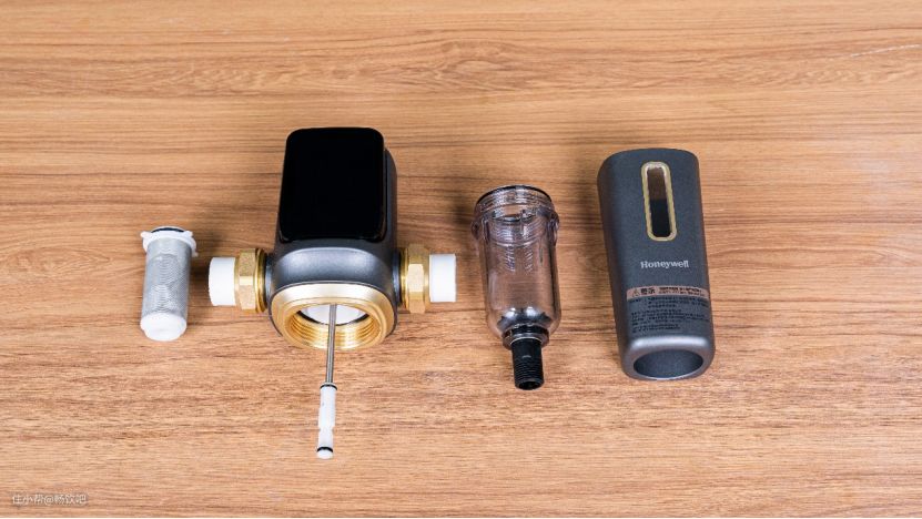 霍尼韦尔前置过滤器在滤瓶外套了一层外壳,拆卸起来还算方便,将外壳拆下来后,稍微用力就能将铜头拧开。
