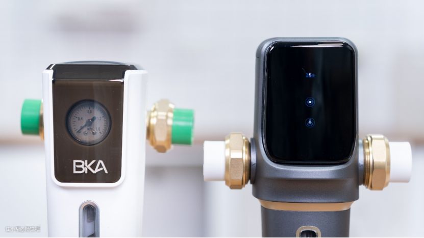 五款前置过滤器中,美的、史密斯和3M均没有采用显示屏设计;BKA配有一个水压监测表,用以水压的监测;霍尼韦尔则搭载有显示屏,通过三节五号电池供电,显示屏支持触控操作,可以设定自动冲洗的时间。