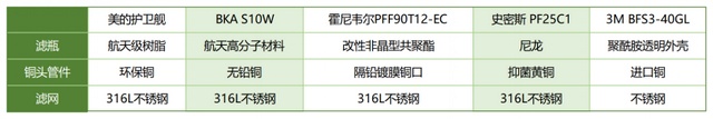为了让大家更直观地了解五款前置过滤器不同的材质用料,我总结出以下表格: