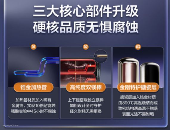 海尔将内胆升级为金刚特护搪瓷层:钢板层-耐高压;密着层-能实现同步的热胀冷缩;搪瓷层-耐腐抗垢;这样制作出来的内胆,表面光洁不易附水垢,水质更健康。