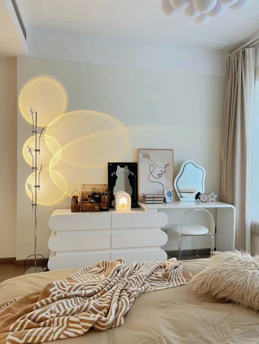 卧室整体色调是奶茶色系,搭配的所有软装都会在这个色系范围内挑选,或深或浅的奶茶色、奶油色、白色,不要放颜色很鲜亮的物品刺激视线。