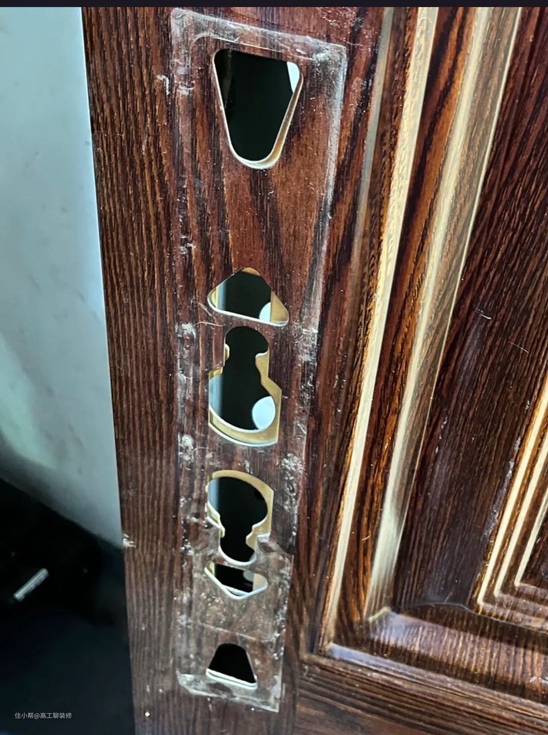 智能门锁和机械锁从开孔上是有区别的,智能门锁安装时,多开一个孔,所以现场看着师傅开孔,不要把孔开的特别大,一旦多余的孔隙露在外面的话,很容易影响美观。