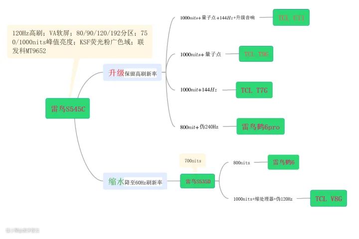 在我看来S545电视宇宙的电视,大体上可以分为带高刷的和不带高刷的两类,在我画的图中也分好了两条线路,其他增值选项就不那么重要了。
