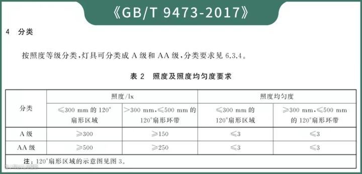 照度指光照强度,即台灯够不够亮,数值越大越好。根据国标《GB/G9473-2017》,如下图所示,国标根据照度等级,将灯具分为A级和AA级。
