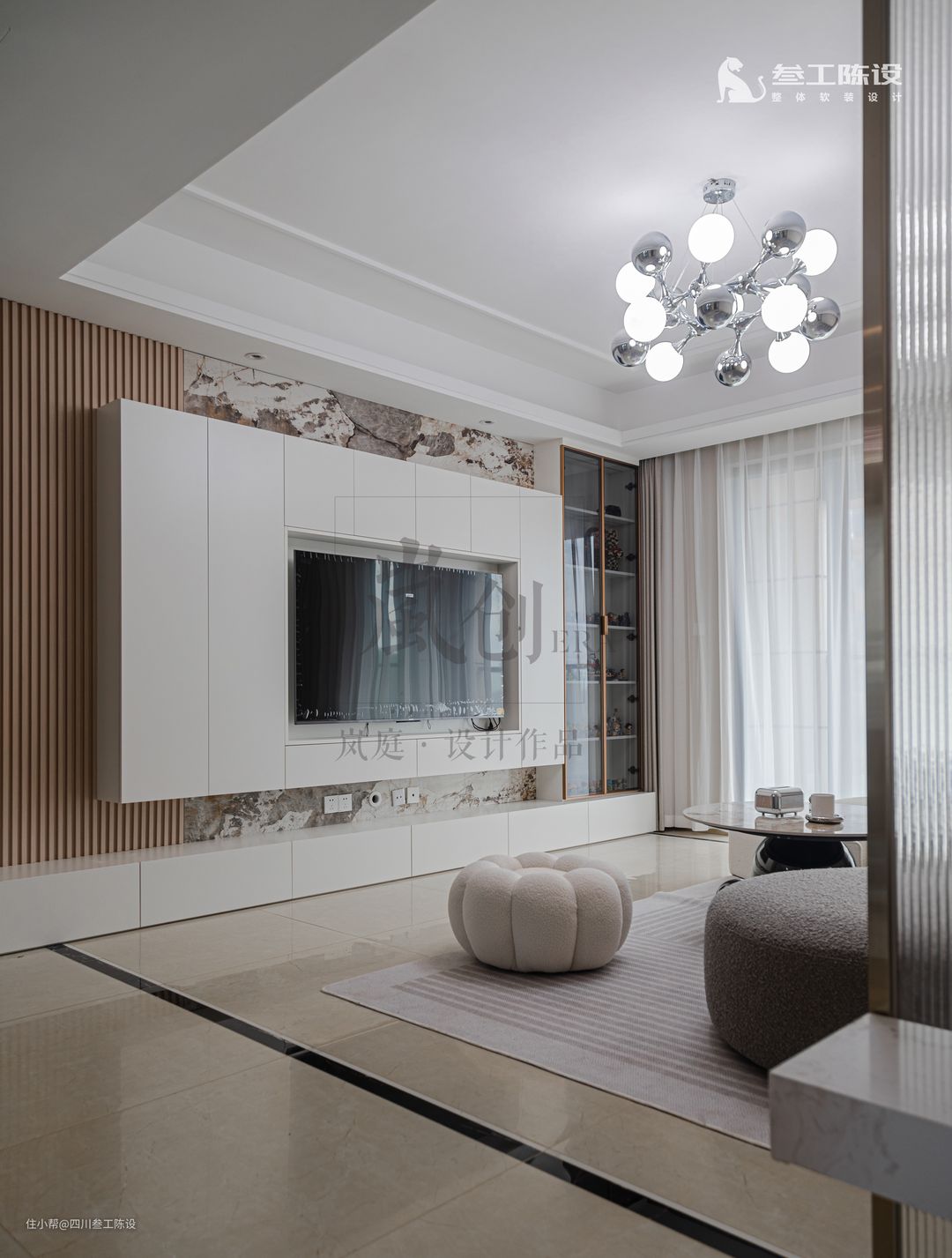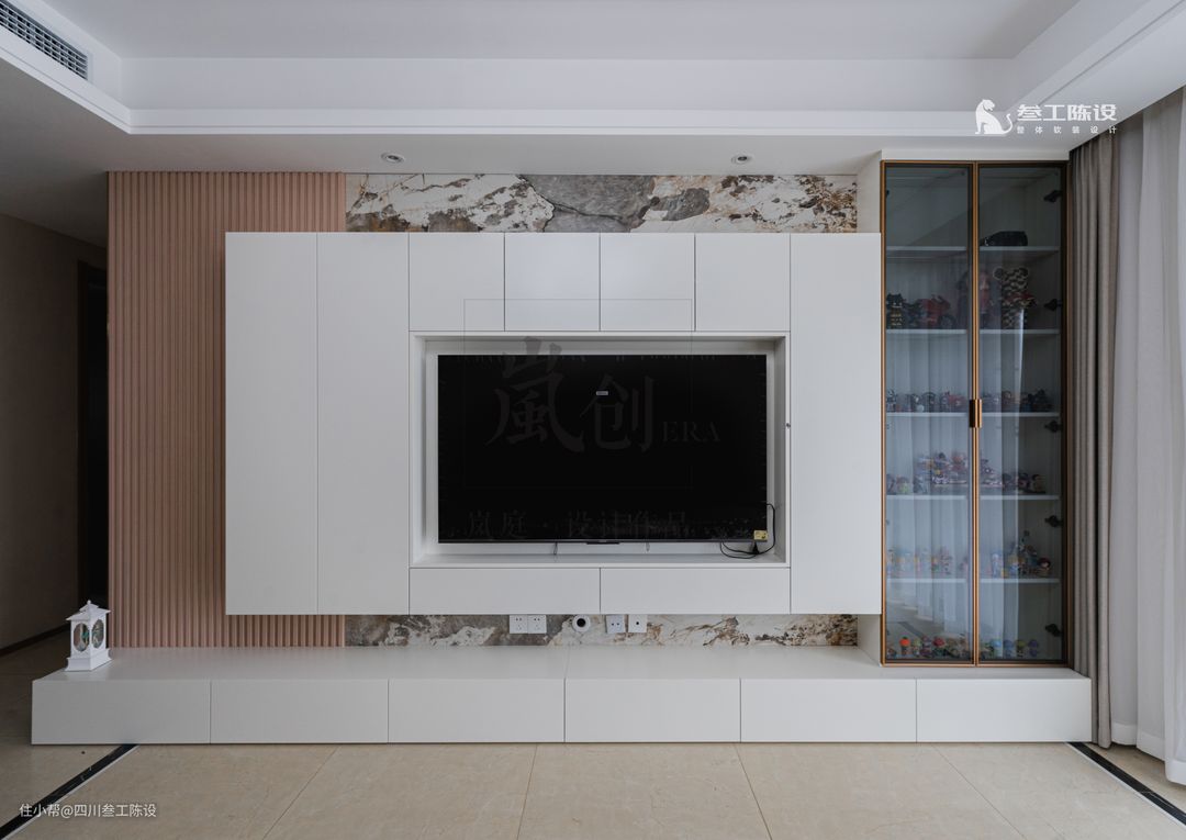 背景墙非常有特色,墙面独特的岩板自带花纹,旁边用实木格栅区分,避免太过单调,墙面整体更加精致。上方才是白色电视柜,里面嵌入电视,下面的电视柜体直接贴合地面,留住空气感,另外不留卫生死角,更易打扫整理。