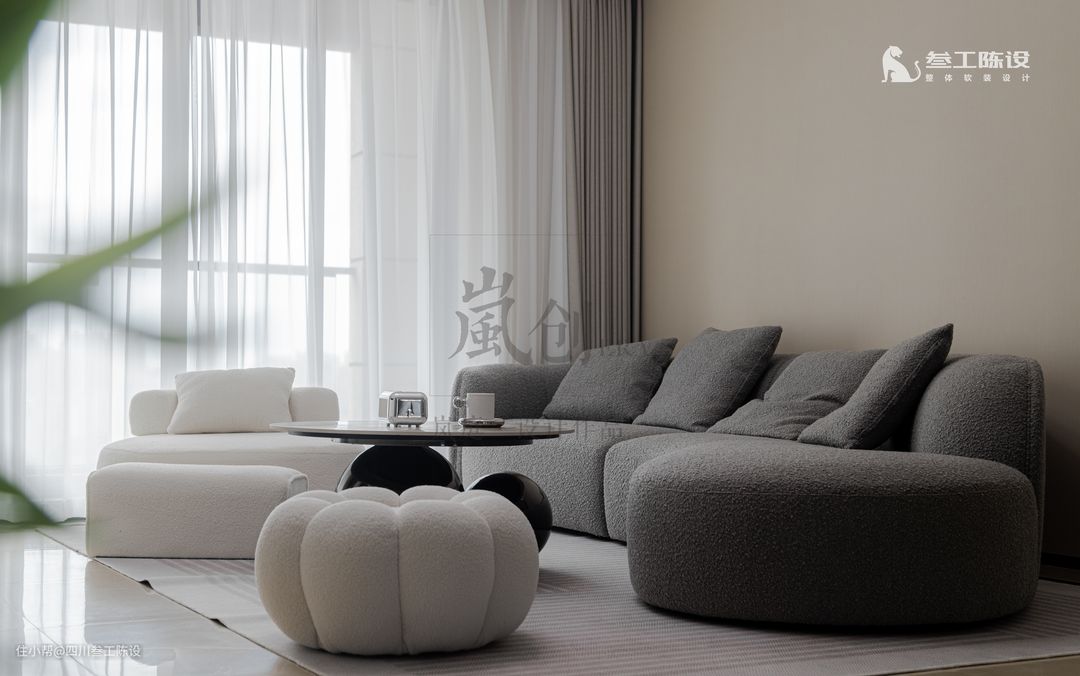左边是圆形单人布艺沙发,前面放了同色的布艺长凳,既有装饰作用,还可以放脚。