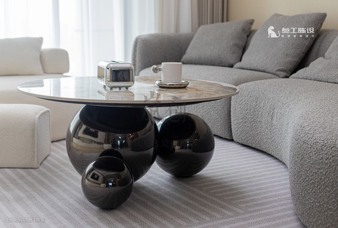 右边是南瓜造型的矮凳,几个沙发是围合式布局,中间的茶几由三个圆组成桌腿,桌面也是圆形,几个圆润的线条使茶几和空间愈发可爱温馨。