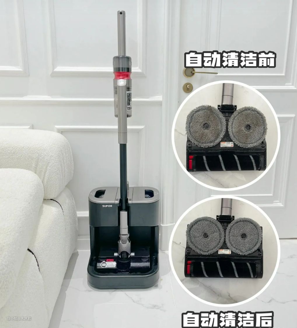 比如我们家一直在用的苏泊尔AP表现就非常不错,不但可以真正做到吸拖一体,而且还能自动清洁,直接解放双手,省心省力还干净!