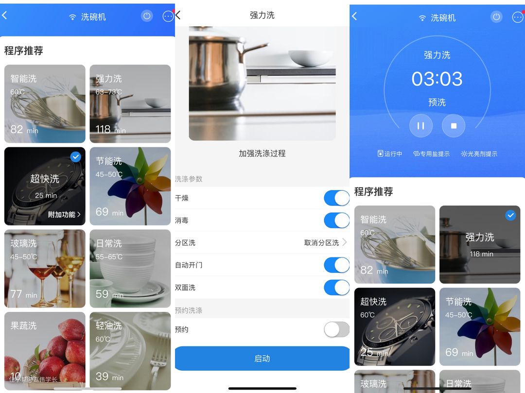 晶彩 W5000 洗碗机支持“海尔智家”APP,通过 APP 可以随时随地一键设置洗涤程序、查看洗碗机运行状态。在洗涤程序选择页也延续了晶彩控制面板的图形化+大图标一键设置,操作起来一目了然。
