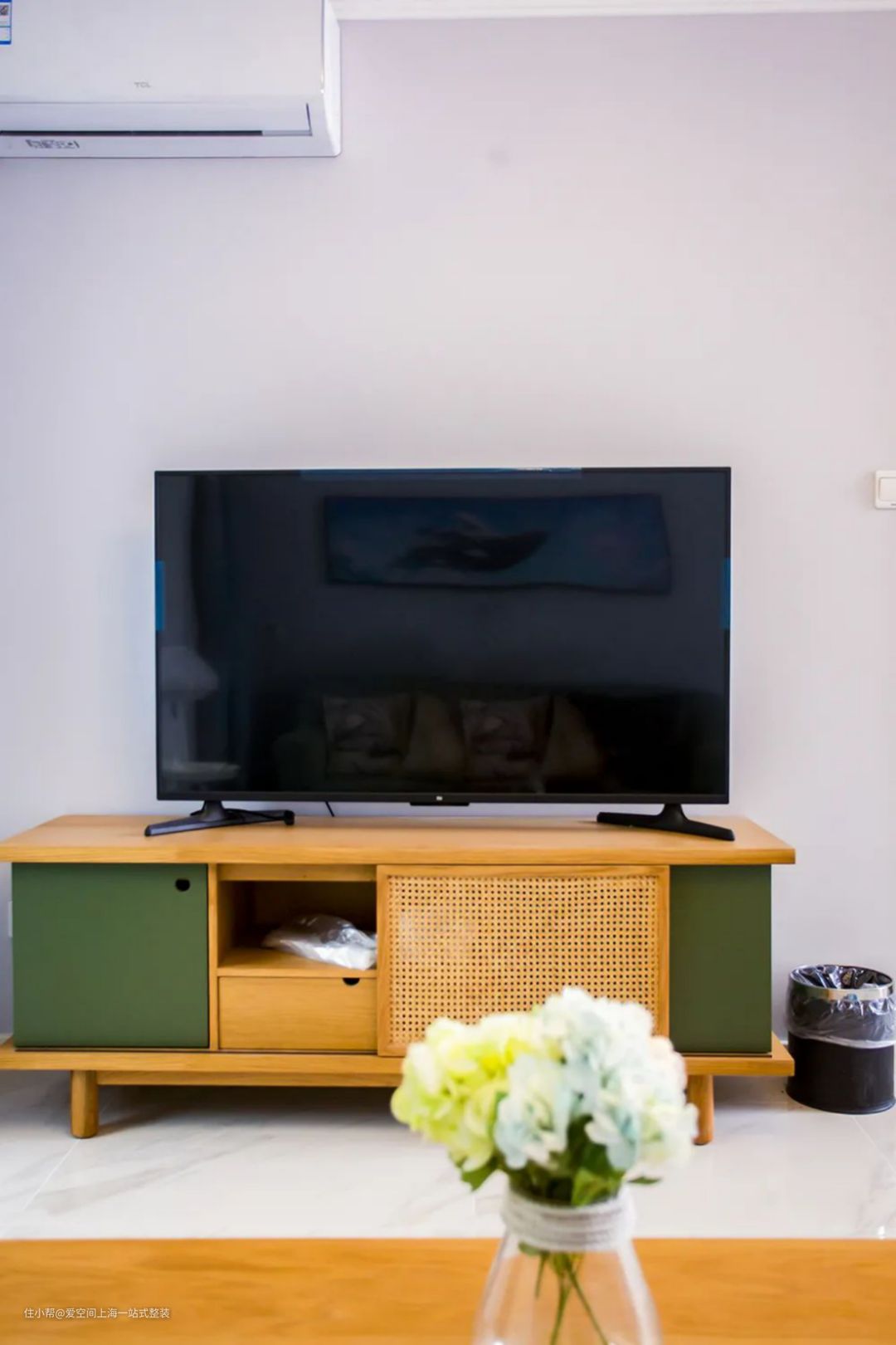 电视柜选用了实木材质,浅黄色木材色彩温和,中和了冷色调带来的空旷清淡。