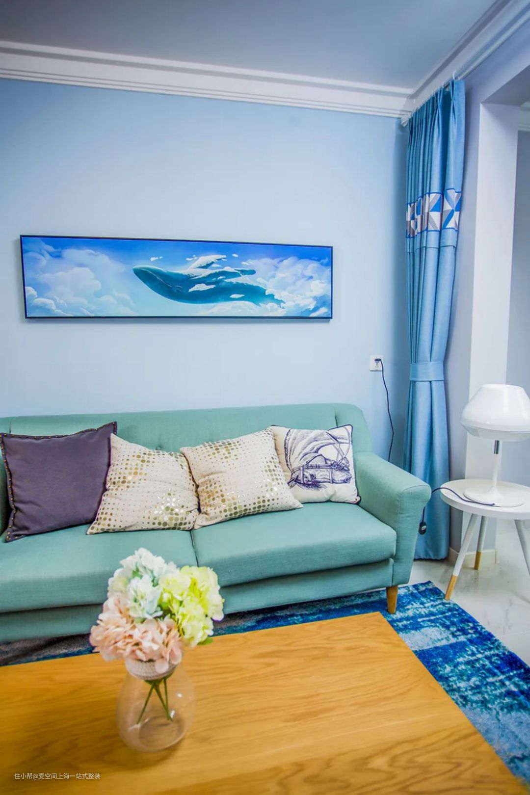 整个客厅以蓝色为主,窗帘、墙面、装饰画以及地毯,相同色系不同色彩让客厅层次感十足又和谐统一。