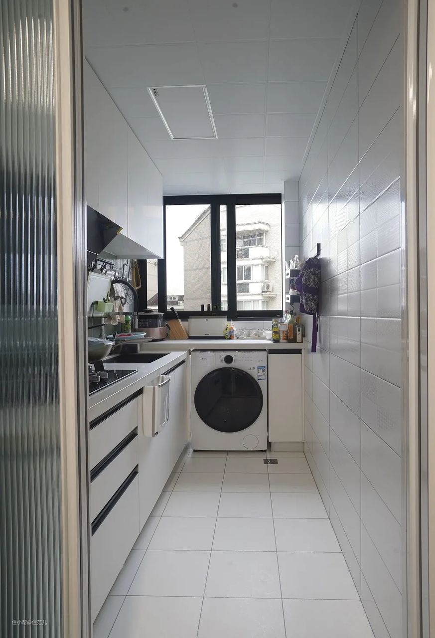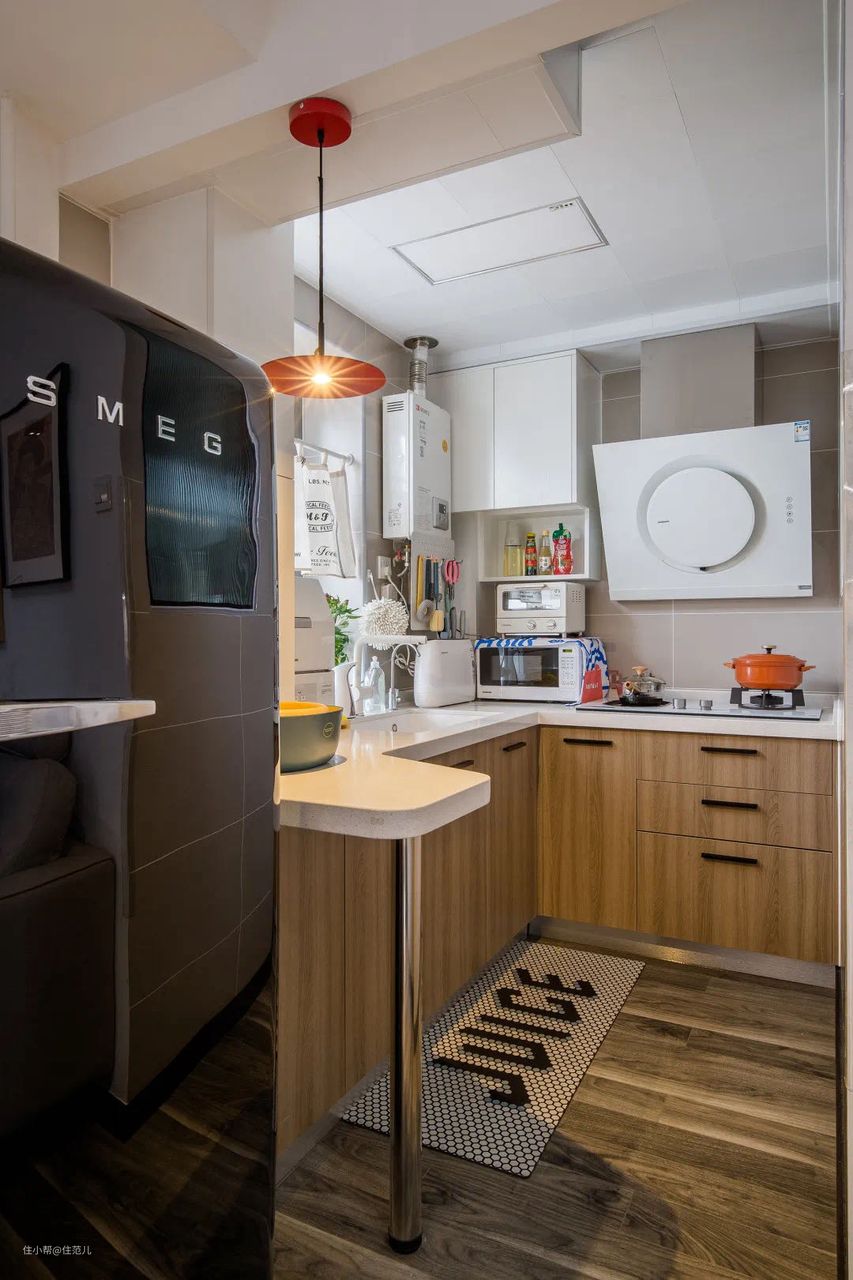 原始户型厨房太小,也可以用这样的方法,把橱柜、水槽、冰箱、厨电统统外置,但要确保动线的流畅。