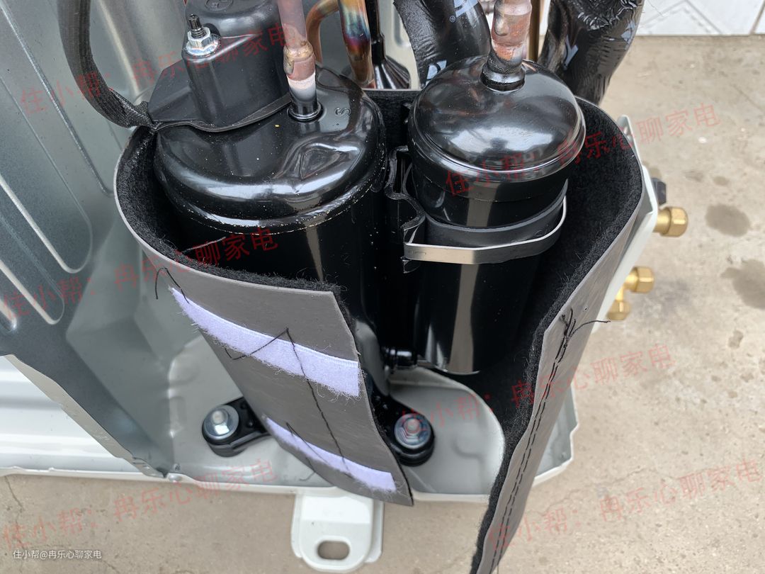 压缩机保温棉是专用保温棉,有两层,一层是只包裹住压缩机和储液罐,另一层是连同压缩机和压缩机旁边的部分铜管也一起包裹住的(忘了一起拍上了),都是专用保温棉,挺厚实的;之前是灰色的回收料保温棉,同时隔音效果也更好。