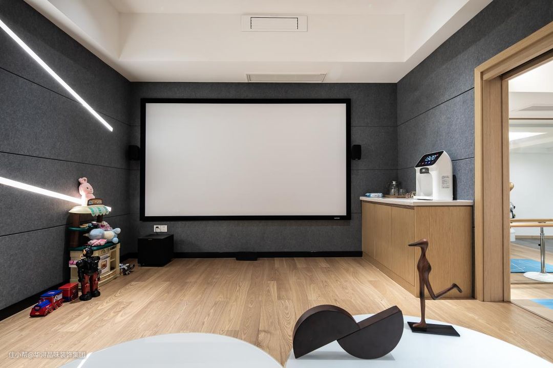 业主一家人有观影的爱好,设计师直接将电影院搬到了家里,整面墙都做了隔音的设计。