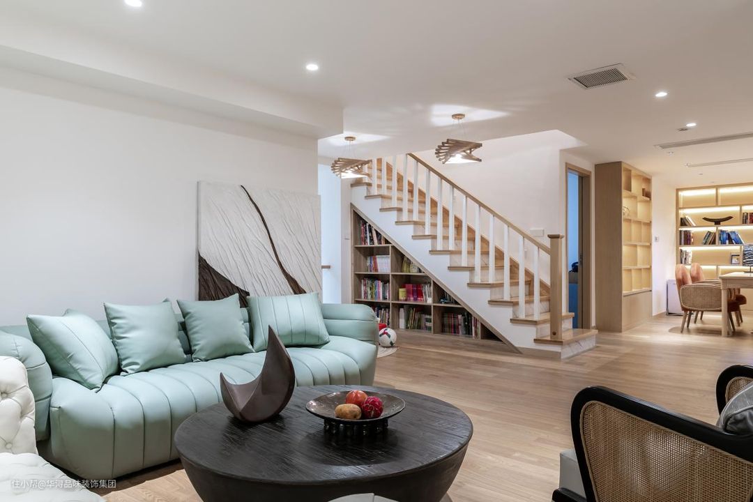楼梯连接着客厅和书吧两个区域,将楼梯下方设计成书架,完美的将三个空间连接在一起。