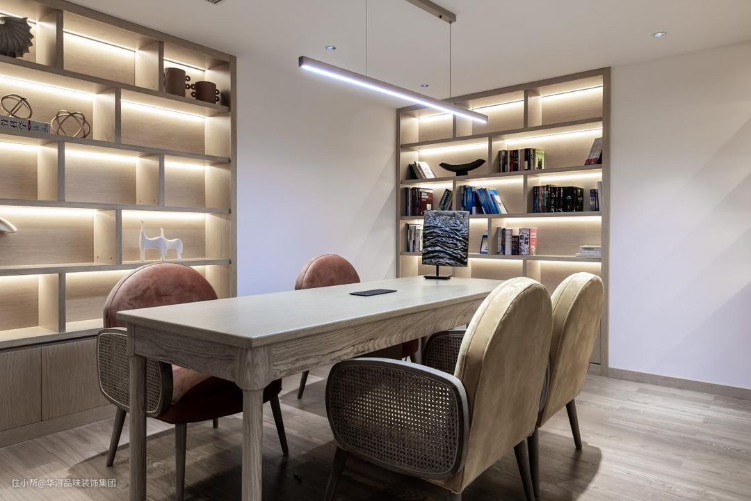 一盏极简的吊灯、一张长方形的原木桌、几张造型简单颜色柔和的椅子,在这里看看书、写写字也成了一种享受。