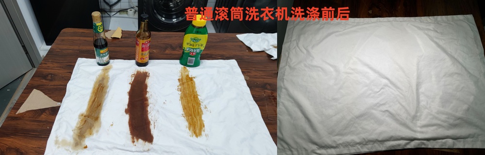 ①普通滚筒洗衣机15分钟速洗模式:白色枕头套+酱油+老抽+蚝油