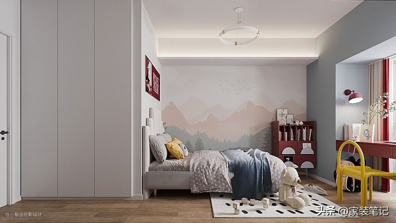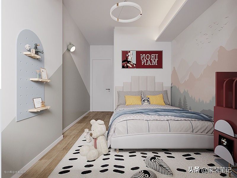 +男孩房合理的利用空间,用飘窗位置做了书桌,让业主的小孩拥有独立的学习空间,这里学习的光线效果也是最好。墙面的洞洞板增加了男孩房的收纳功能,很好用哦。
