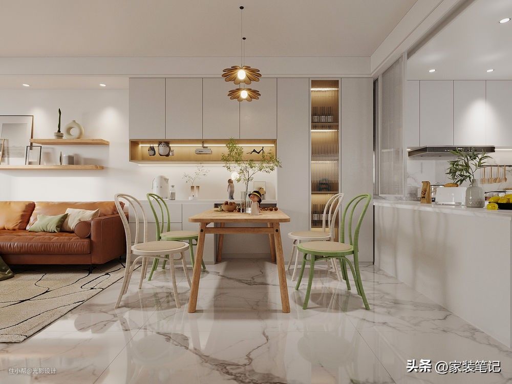 餐厅的另外一个视角,可以同时看到厨房,厨房这边是做的可以收起来的推拉门,这样做的好处让厨房空间的采光变得更好了。