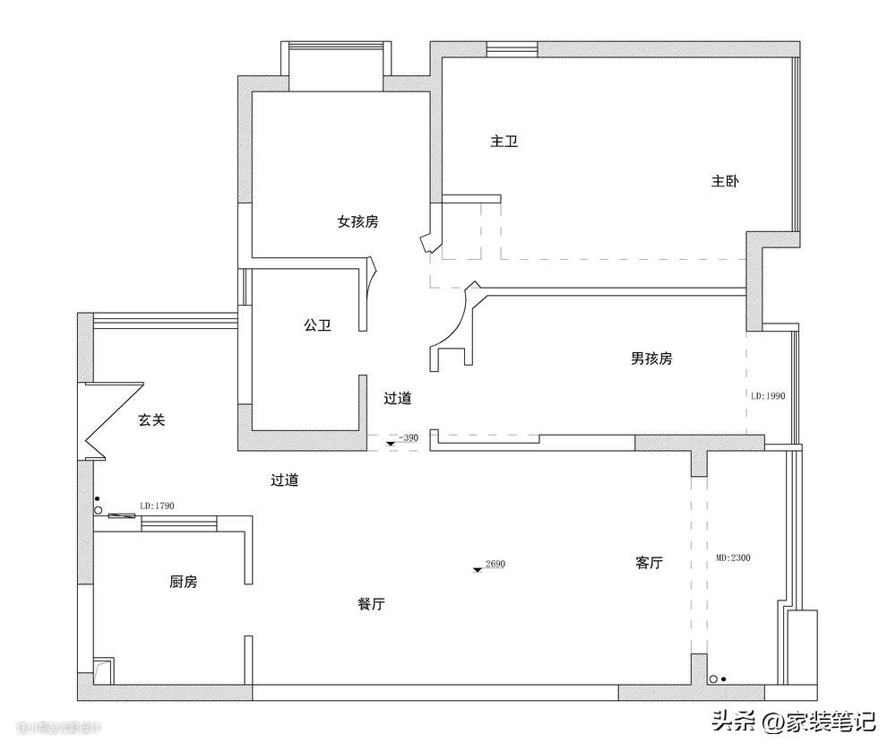 这是一套实际面积是100㎡的三居室户型,业主购买的二手房,所以在过道的位置有一个圆形的造型。房子谈不上南北通透,但是采光效果还挺好的。业主买下这套房子之后,准备随便装一下就住的,但是后来被他老婆阻止了,决定还是设计一下再动工,所以我们现在看到的原始结构是主卫已经被拆掉了。