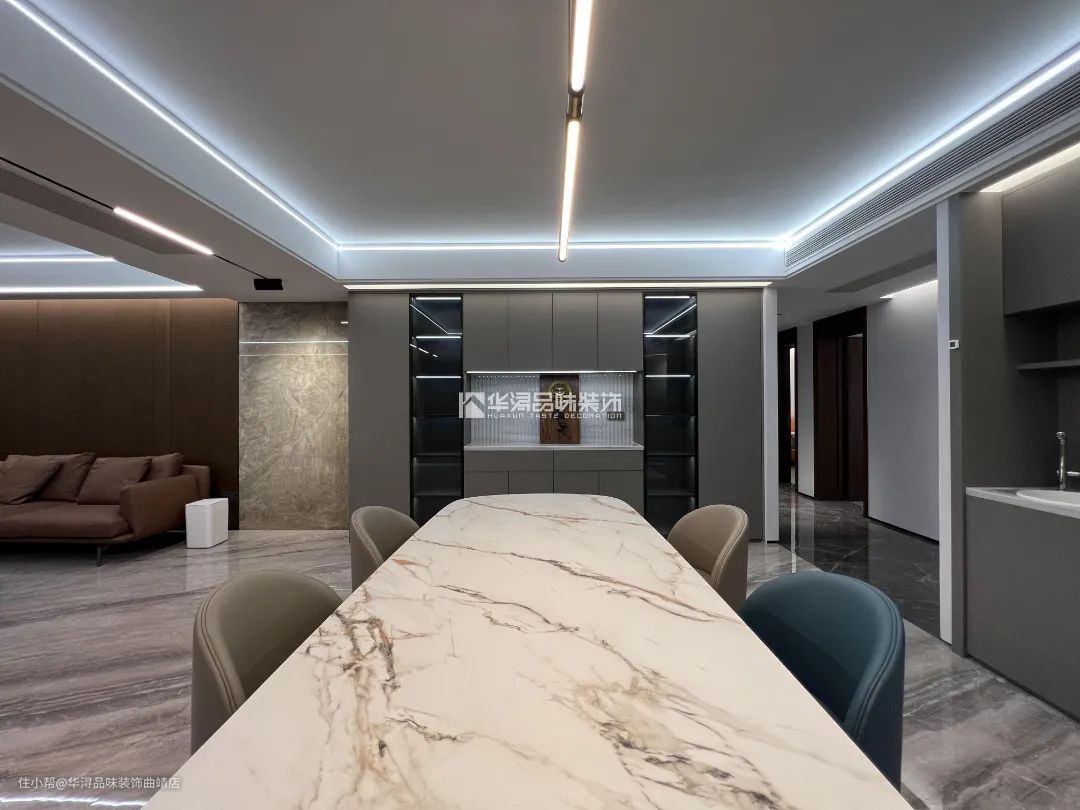 长达3米的哑光大理石纹岩板餐桌配上比较开阔的餐厅空间,极简一字型吊灯离桌面80公分安装,胡桃木包边极具质感,灯光可根据情况调节均匀照亮,打造舒适就餐氛围。