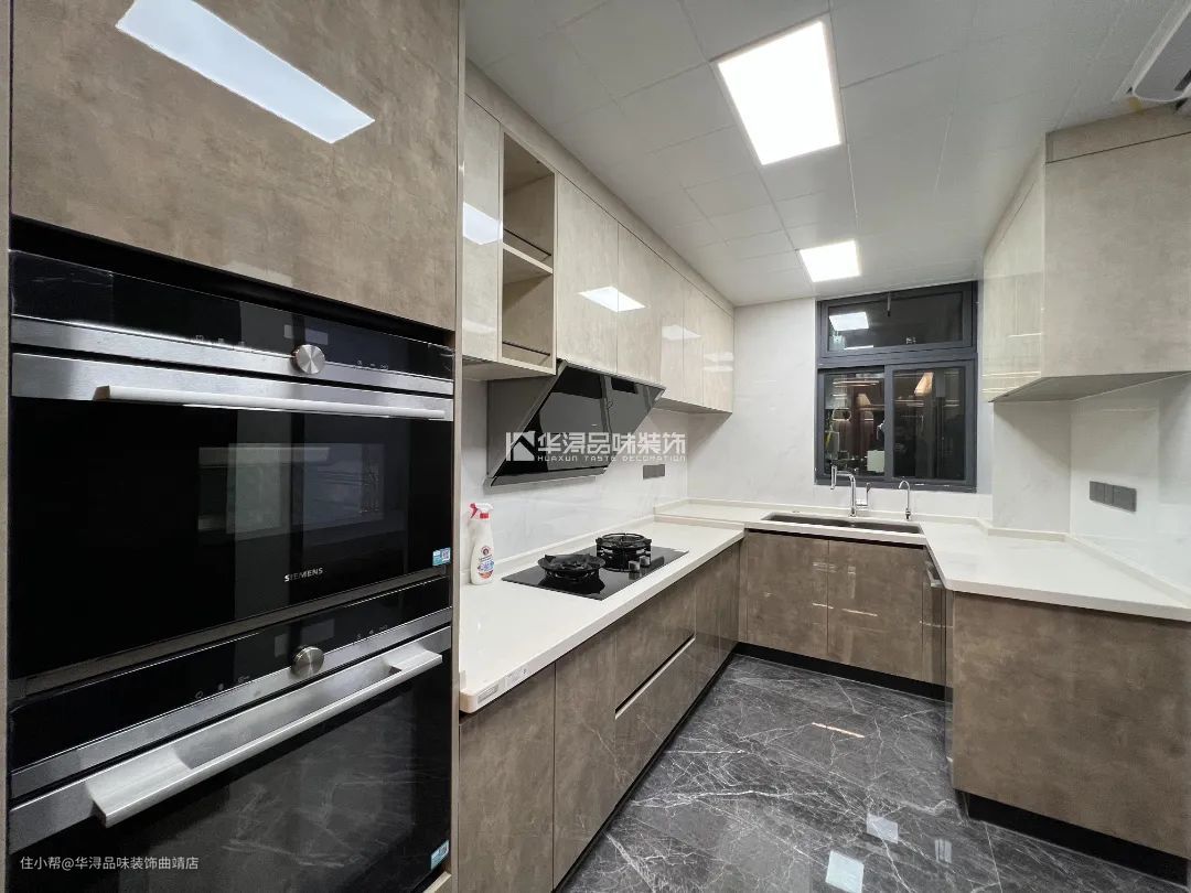 厨房的承重墙处协调内嵌了烤箱等常用家电,延伸了U型操作空间,在实用与美观方面取得平衡。定制烤漆板带着微微的复古轻奢感,彰显生活的审美与品味。在生活动线上,设计师将厨房、保姆房和生活阳台安排在一起,也更具隐私性。