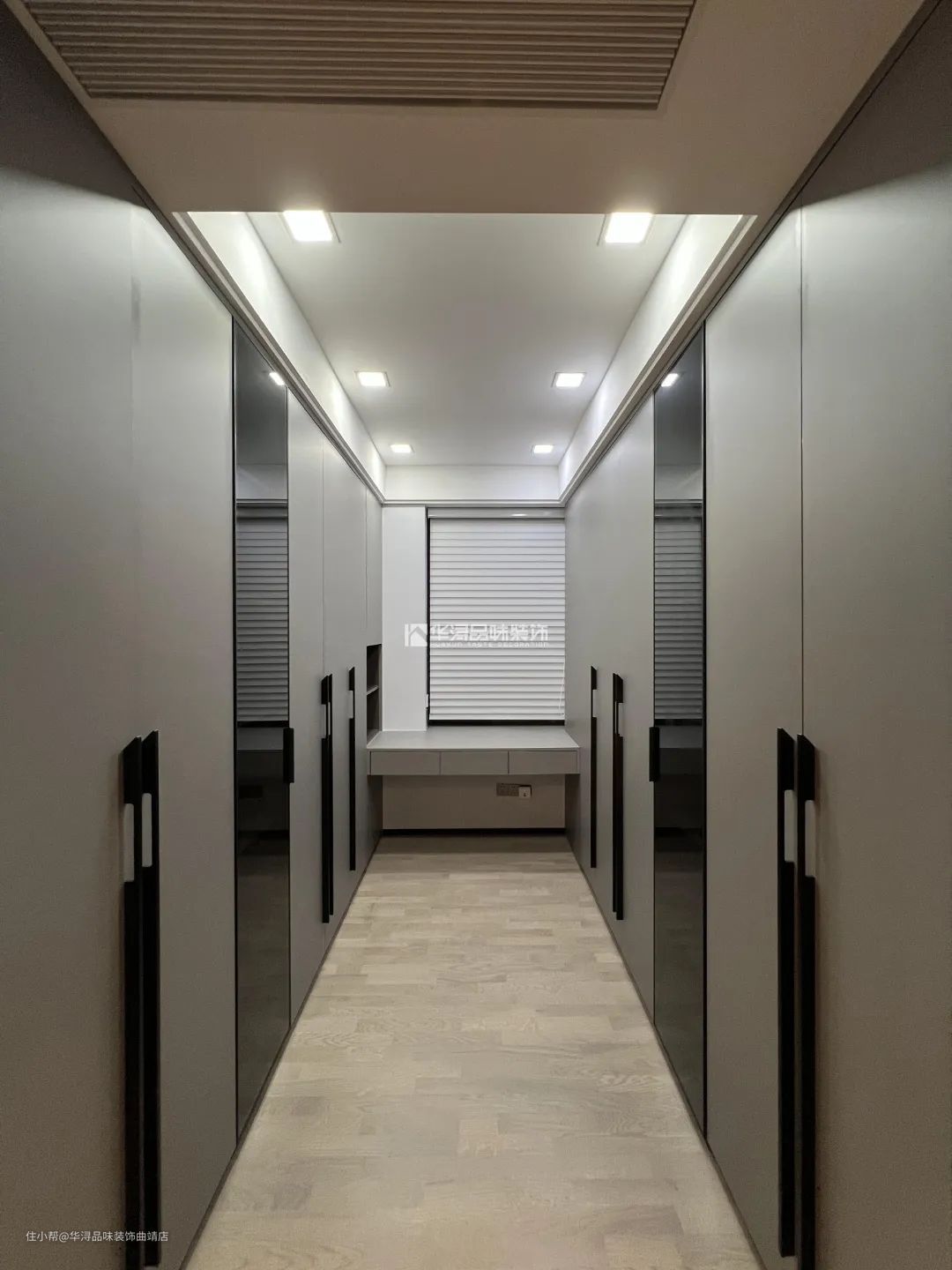 在整体户型结构允许的情况下,单独将一个空间设计成一个衣帽间是最为整洁舒适的方式。可以适当留两面柜门做玻璃材质,用于展示喜爱的单品,这一方空间虽井然有序却透露着浓烈的个人色彩,是宁静而高贵的艺术平衡。
