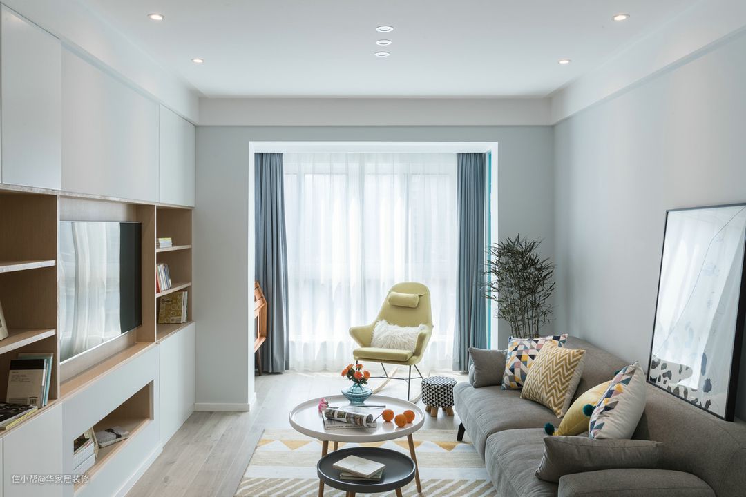 - 电视背景墙用吗满墙柜的设计,将电视包含在里面,白色+原木色柜子,简洁大方让客厅收纳需求增加一倍;