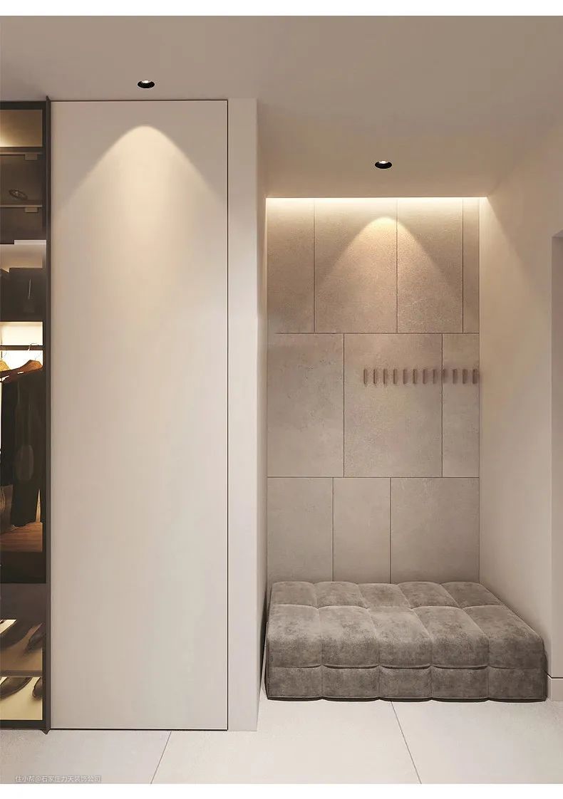 射灯的光源比较集中,且能灵活调节角度,一般用在卧室、客厅的背景墙上,通过多个组合达到洗墙效果,或是用于玄关、走廊等需要装饰的空间,局部衬托设计重点,使得空间的照明效果明暗分明、层次感丰富,会让设计亮点得到更好的凸显。