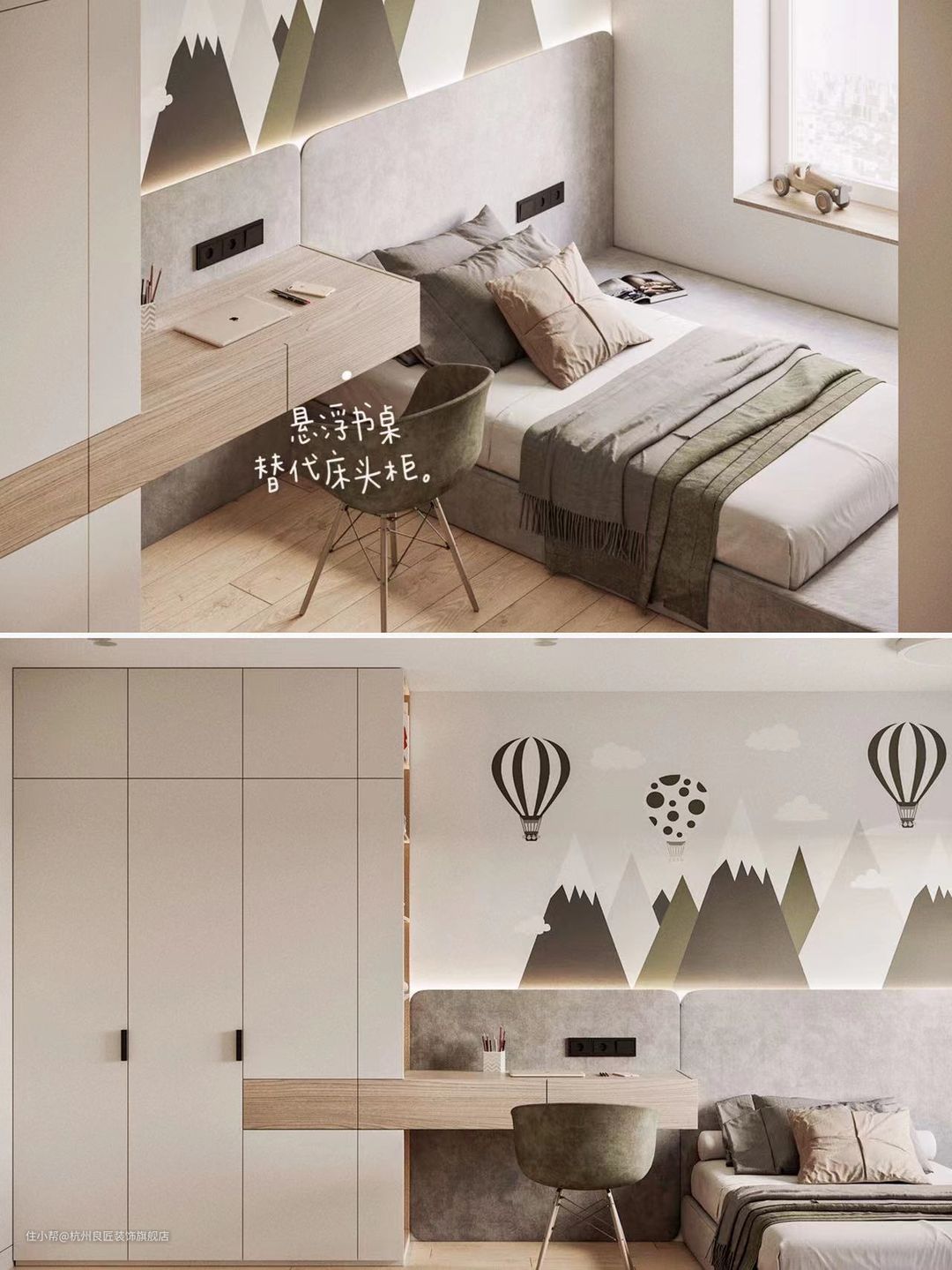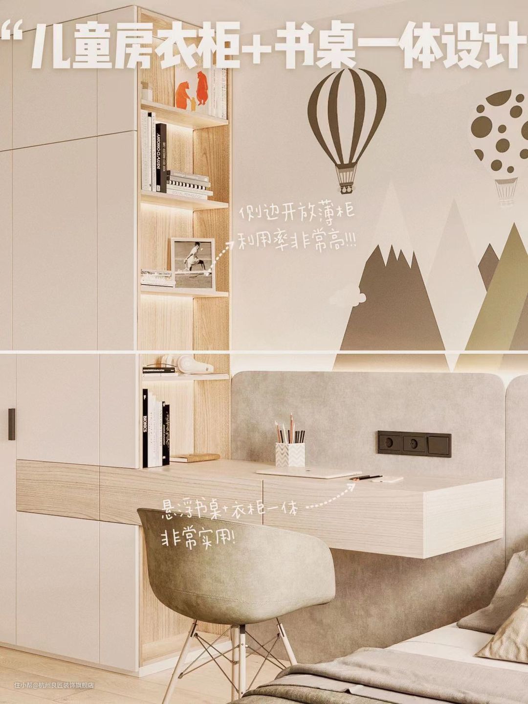 考虑到小户型儿童房的「实用性」和「收纳」需求,做了一个带「悬浮书桌」和一个「侧边开放薄柜」的设计。可同时满足孩子的衣服收纳、图书收纳和学习的需求,空间利用率也非常高💯。